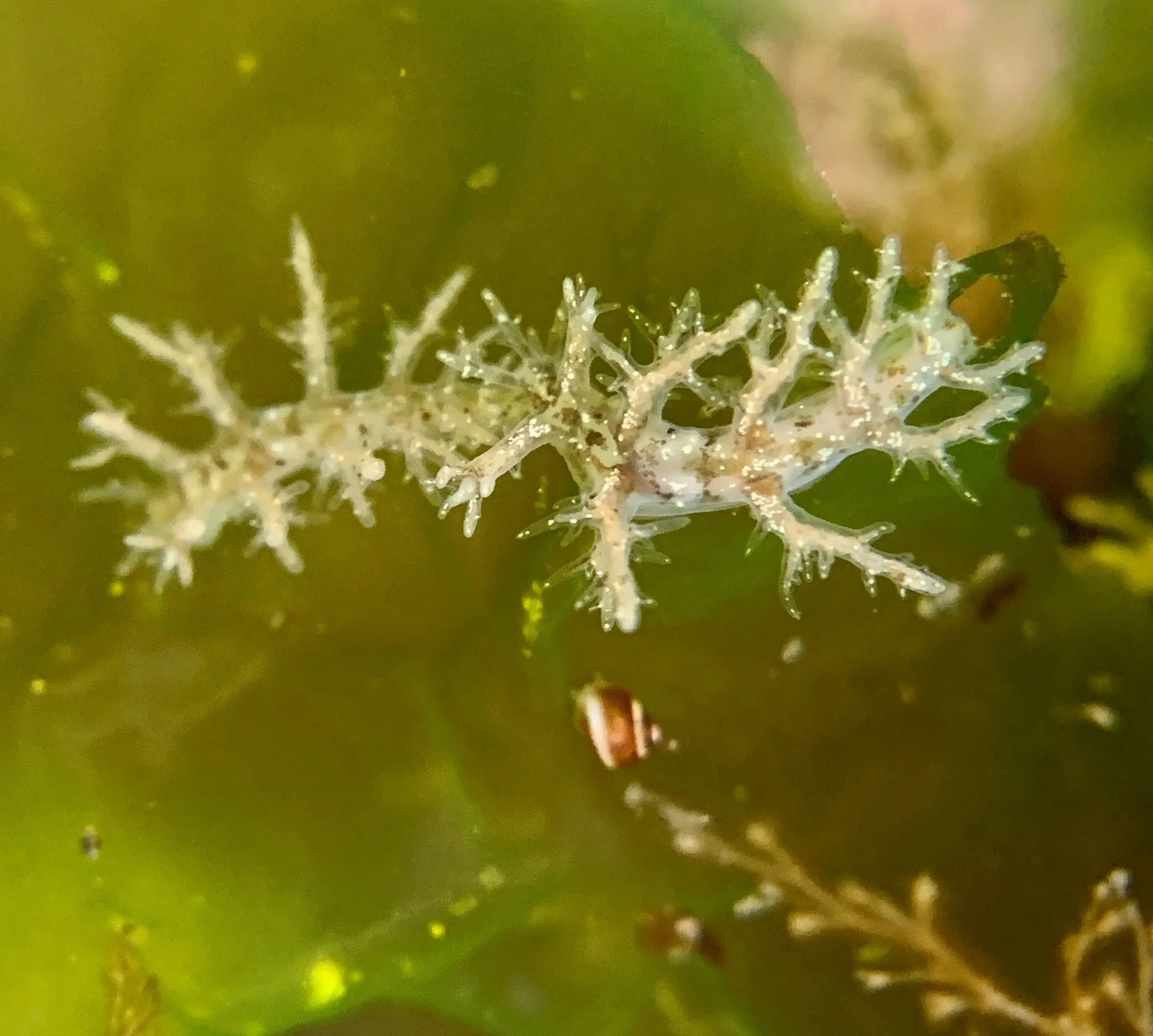 Description: The bushy-backed nudibranch is named for the two rows of branching bush-like appendages down its back. Their overall color can be various shades of off-white, green, or brown including the body and back appendages. The bottom of their foot is often a lighter color than the body. They can get up to 5 cm, but in the tide pools we more often see them 1.5-3 cm long.