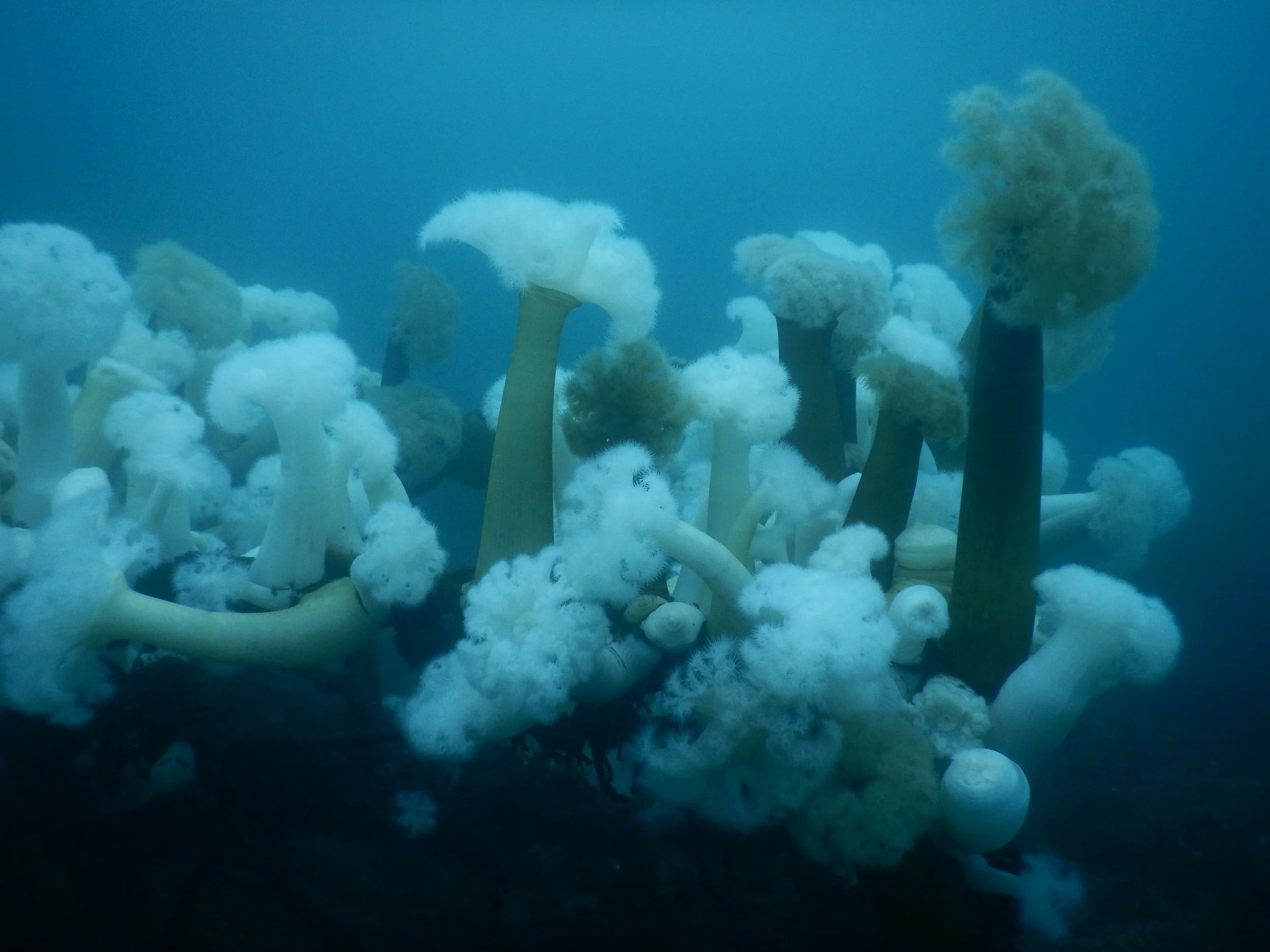 Open plumose anemones underwater (photo credit: Katie Corliss)