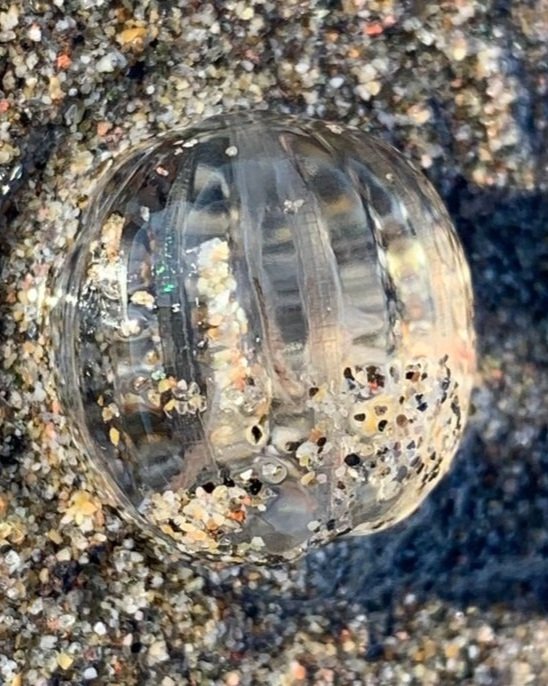 Jellies have been floating in oceans across the world for hundreds of millions of years. These adaptable creatures are classified as a type of plankton due to the fact that they drift in ocean currents. True jellies have two primary life stages: the polyp phase where it is attached to a substrate, and the medusa phase where they develop a bell and tentacles. Comb jellies, like the Pacific sea gooseberry, are covered in cilia - little hairs that are fused in rows called combs - that help them swim and reflect light giving off a rainbow appearance. While commonly called jellies, comb jellies are actually not true jellyfish! Jellyfish (along with sea anemones and hydroids) are in the phylum Cnidaria and all contain stinging cells. Comb jellies, on the other hand, are in the phylum Ctenophora and do not sting but instead catch prey through sticking cells. At Haystack Rock it is common to have hundreds of the same species of jelly wash up when currents happen to push a jelly bloom towards shore. Although not all species of jellies in Oregon sting, it is best practice to avoid touching all jellies. Even a dead jelly could still sting!