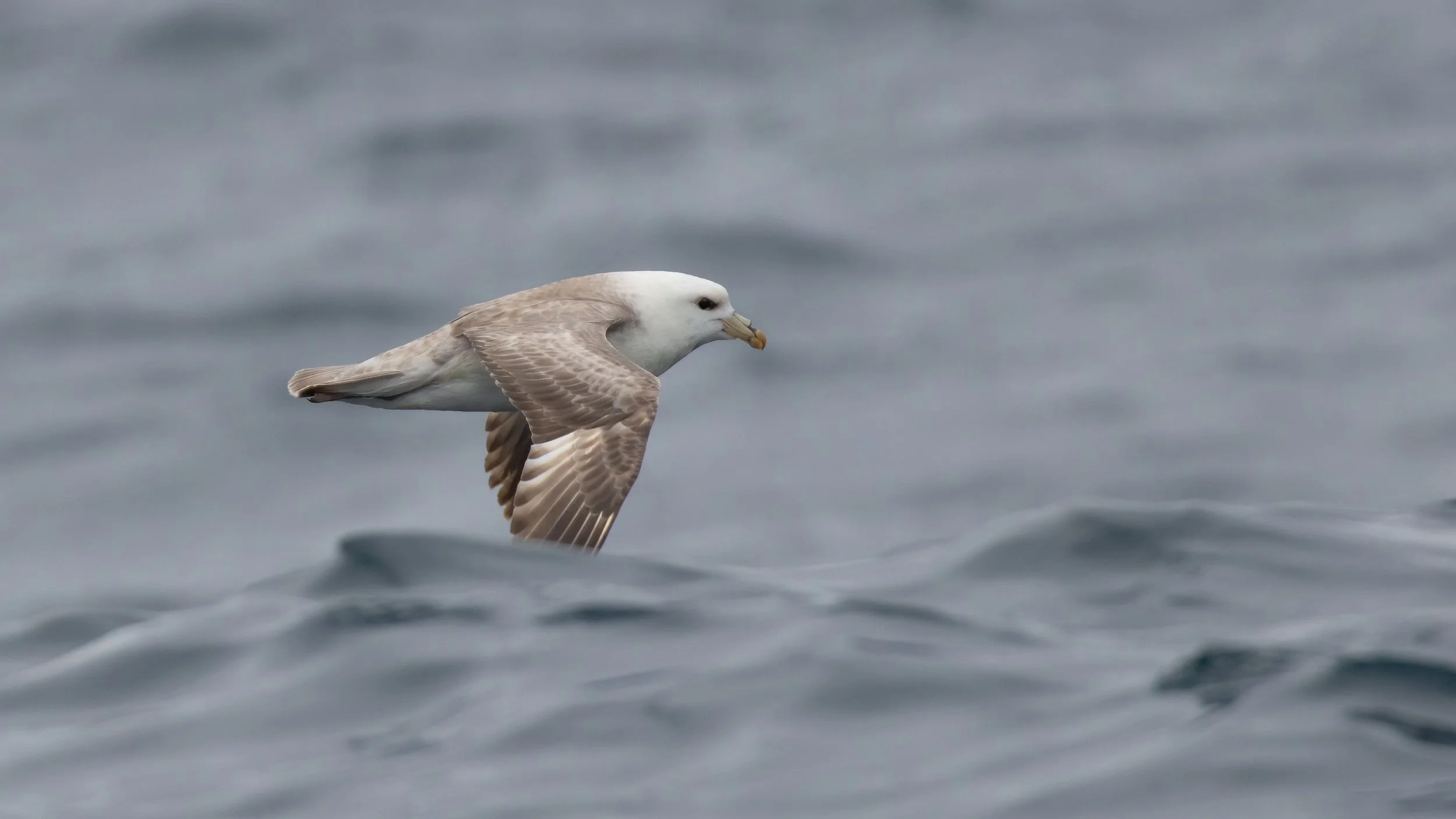Description: Northern fulmars have a body shape similar to a gull, but with longer, narrow wings. They have a yellow beak and their feathers are either a uniform gray (dark morph), or a white and light gray combination (light morph). They are rarely seen from land, but if on a boat, you can spot them flying over the water with a fast wingbeat.