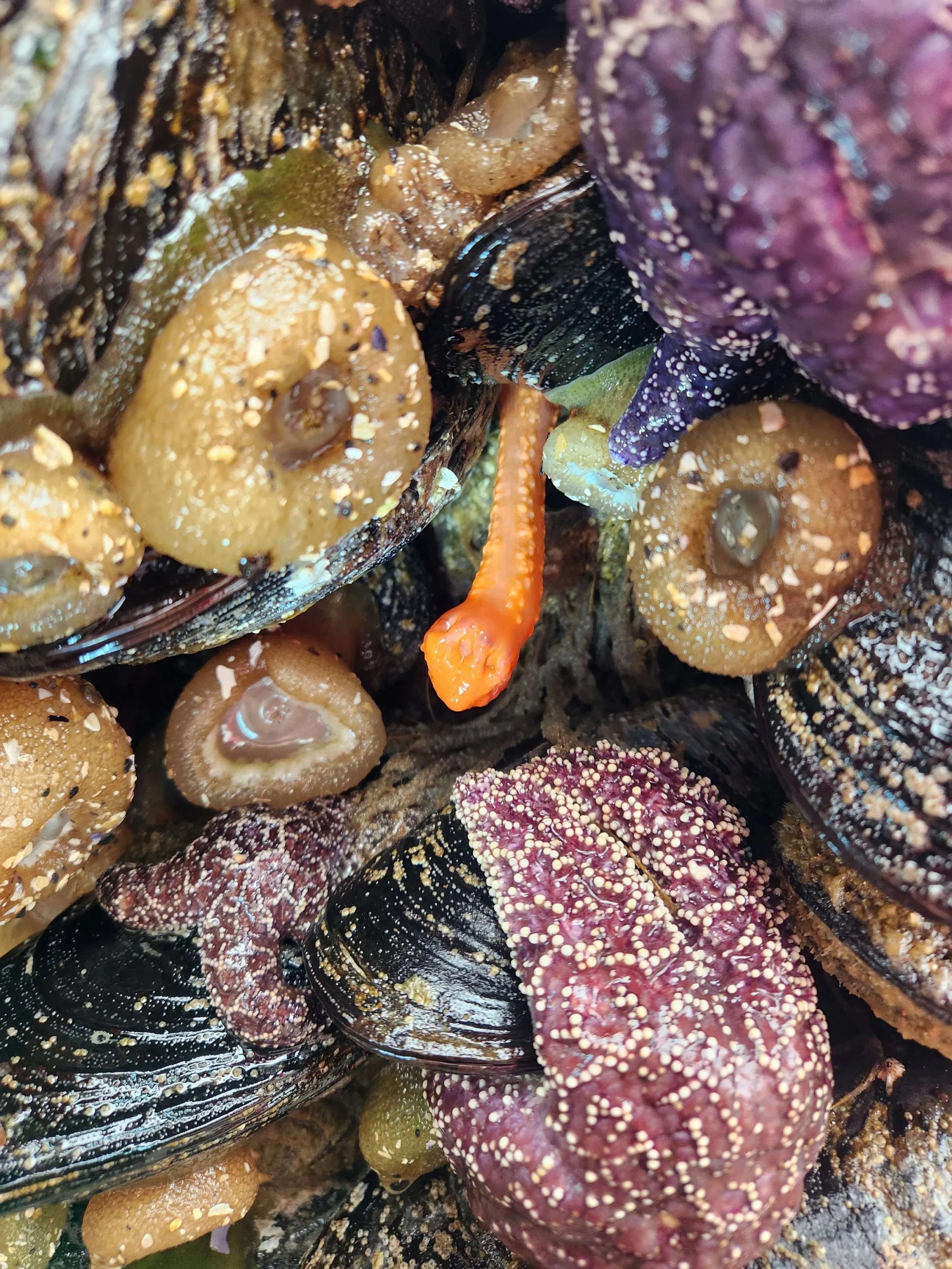 Orange sea cucumber hiding in mussel bed among sea anemones and sea stars (photo credit: Katie Corliss)