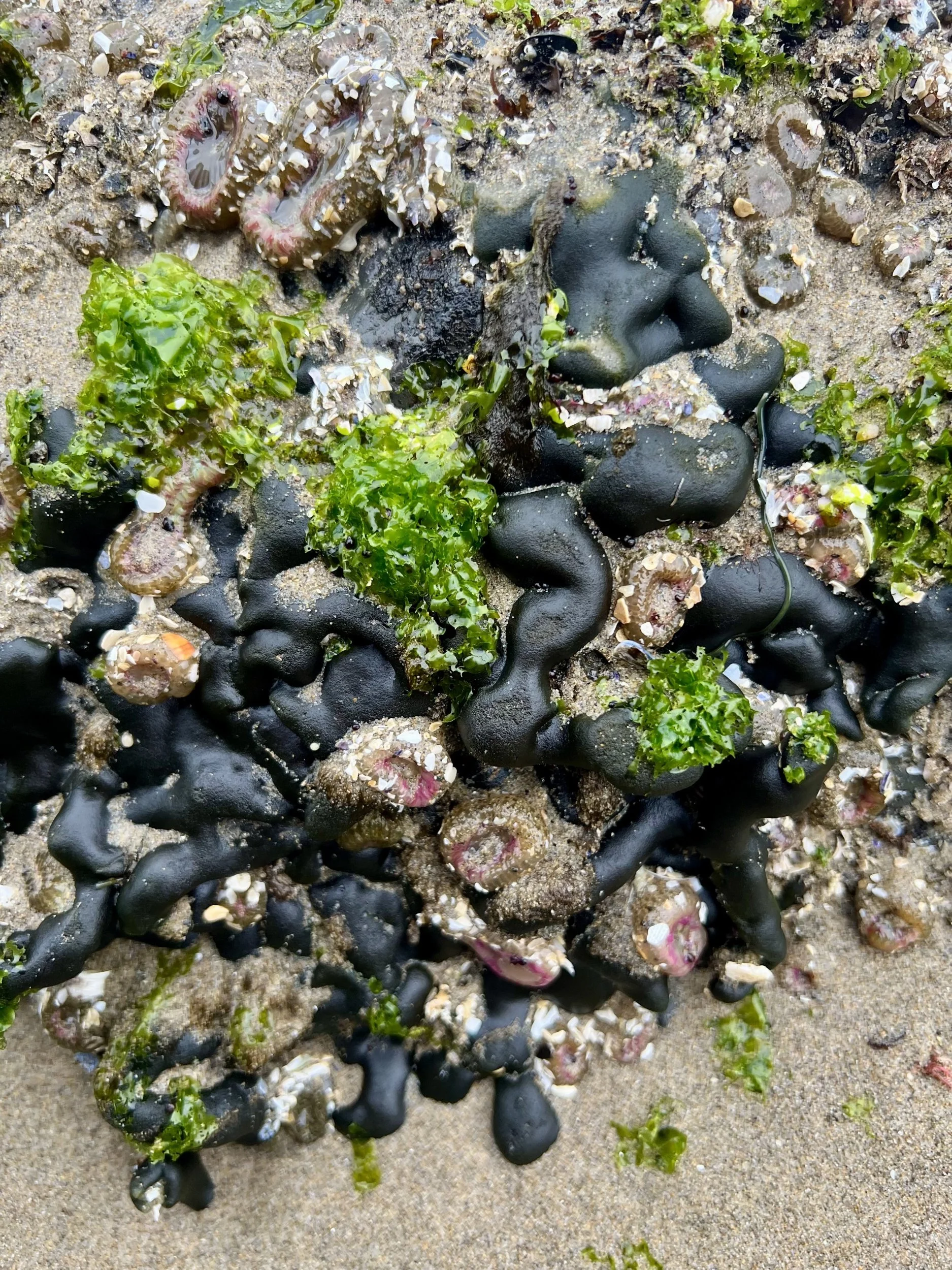 Spongy cushion (black) with sea anemones and sea lettuce (green) (photo credit: Maddy Gooldy)