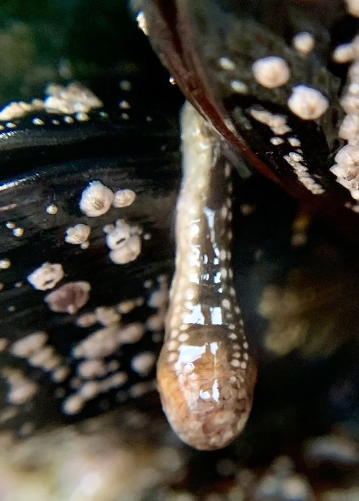 Tar-spot sea cucumber hanging between California mussels (photo credit: Molly Sultany)